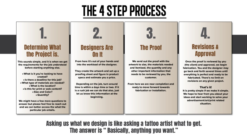 We are dedicated to delivering high-quality, detailed designs that stand out from ordinary, flat visuals. Our work is crafted to be both engaging and relatable to the everyday consumer while remaining highly effective. Ready to get started? Click the button below to book or request a quote! Check out our 4 Step Process below…